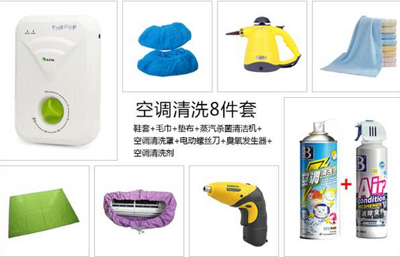 空調清洗8件套,包括:鞋套、毛巾、墊布、蒸汽殺菌清潔機、空調清洗罩、電動螺絲刀、臭氧發生器和空調清洗劑。